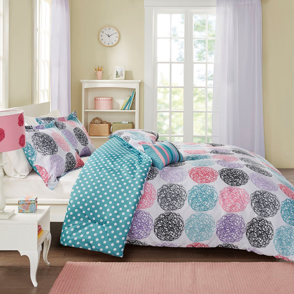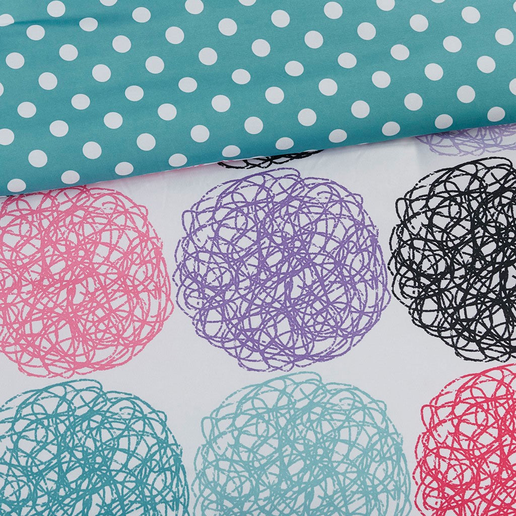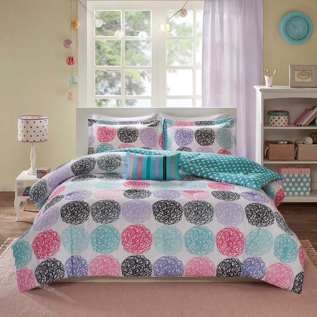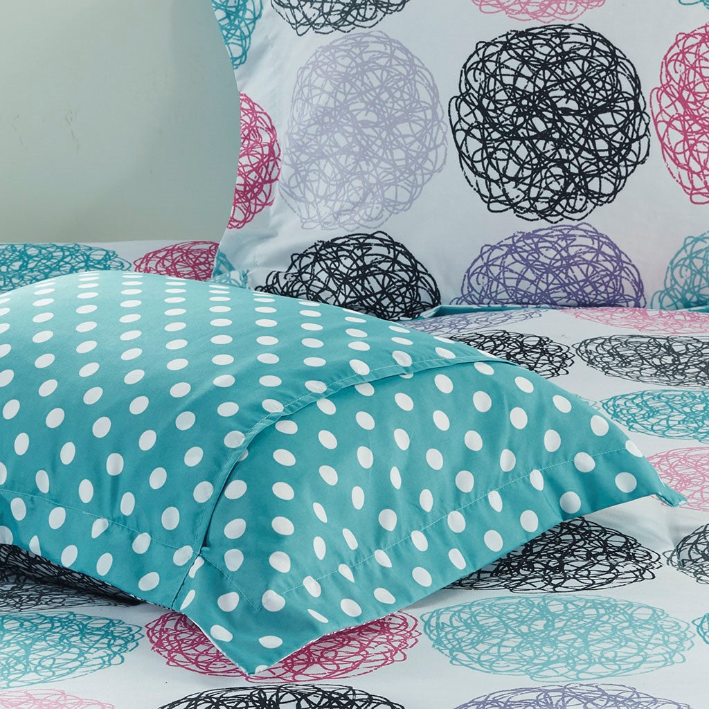 Bright and colorful, the Mi Zone Carly Reversible Comforter Set adds a fun and cheerful touch to your bedroom. This comforter flaunts a vibrant circular doodle pattern with a white polka-dot print on the teal reverse, for a dazzling look. The 2 shams (1 in Twin/TwinXL) match the design of the comforter, while 1 oblong decorative pillow with a striped ribbon design provides a vivid finishing touch. Made from ultra-soft microfiber, this reversible comforter set uses an antimicrobial treatment that provides built-in freshness protection, reducing the growth of odor causing bacteria to keep fabric lasting longer.
