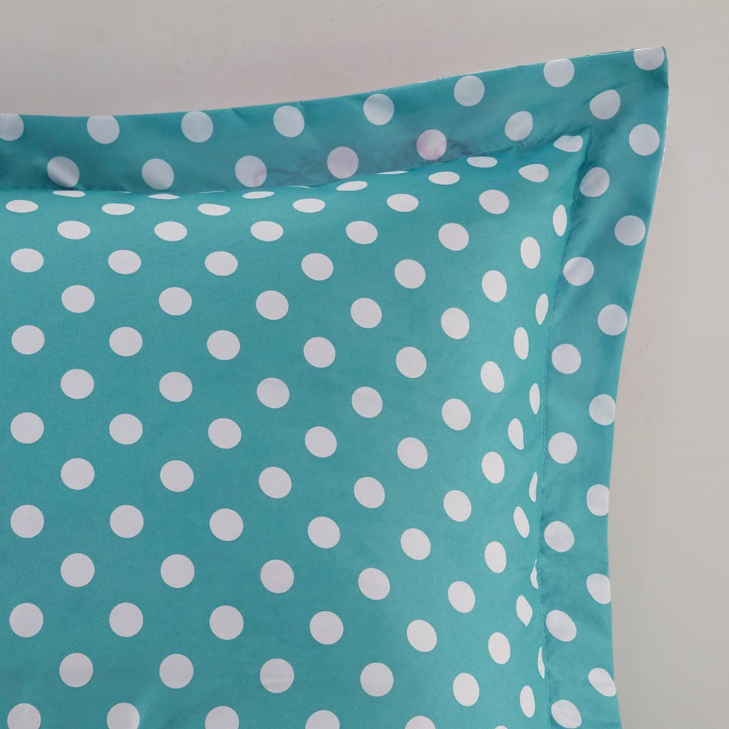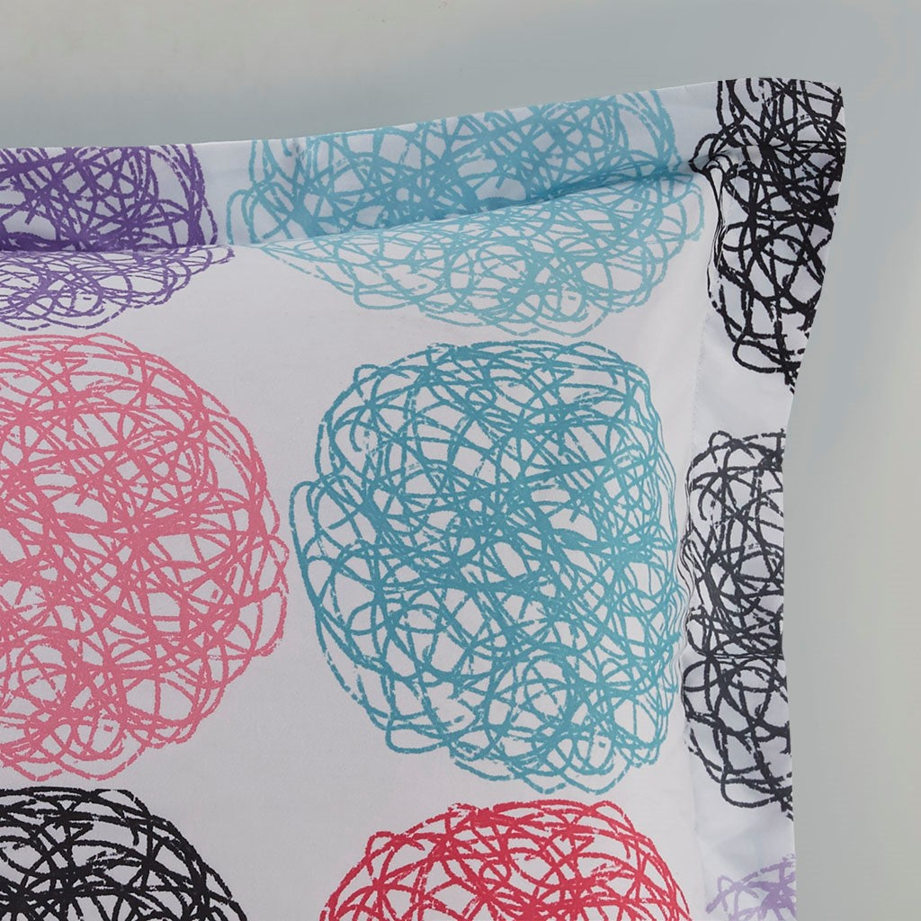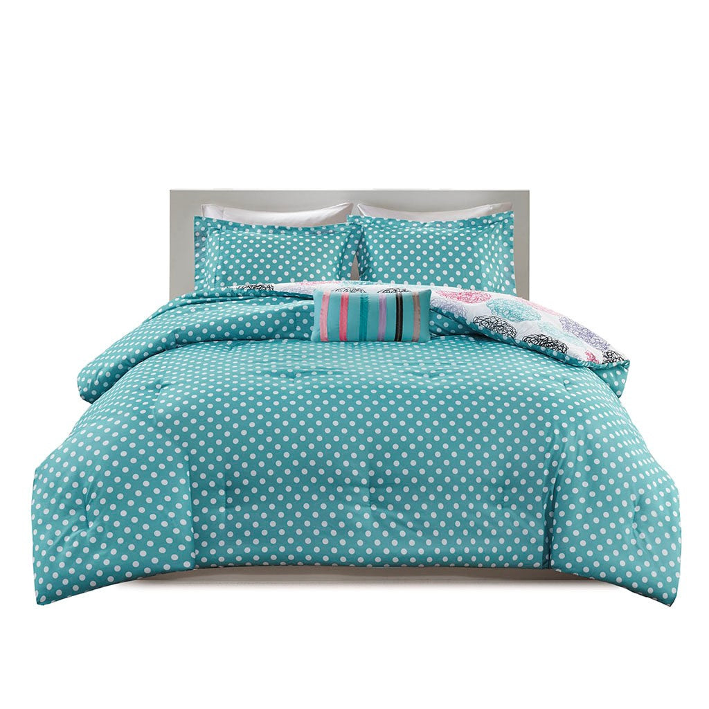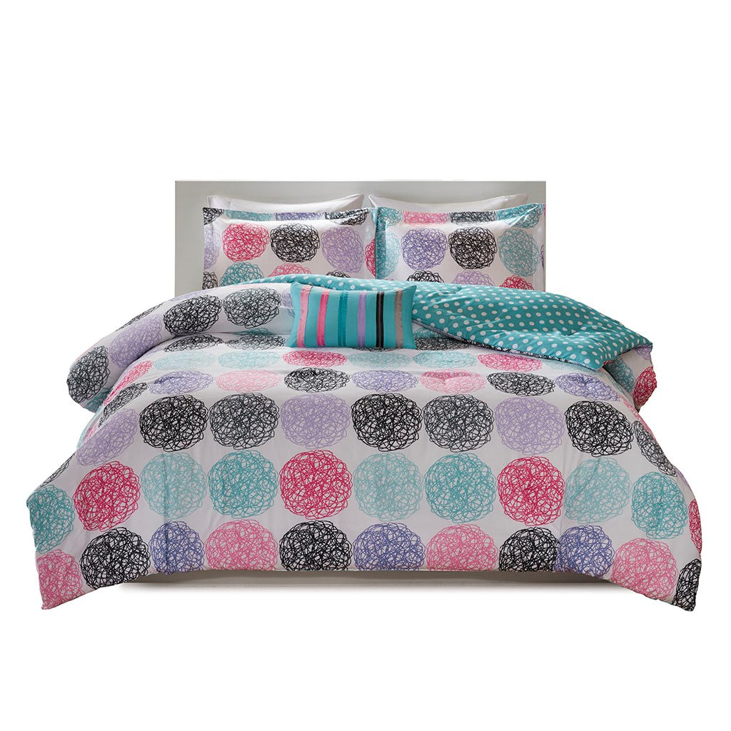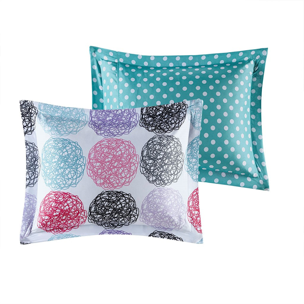 Bright and colorful, the Mi Zone Carly Reversible Comforter Set adds a fun and cheerful touch to your bedroom. This comforter flaunts a vibrant circular doodle pattern with a white polka-dot print on the teal reverse, for a dazzling look. The 2 shams (1 in Twin/TwinXL) match the design of the comforter, while 1 oblong decorative pillow with a striped ribbon design provides a vivid finishing touch. Made from ultra-soft microfiber, this reversible comforter set uses an antimicrobial treatment that provides built-in freshness protection, reducing the growth of odor causing bacteria to keep fabric lasting longer.