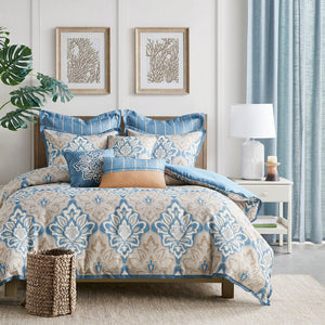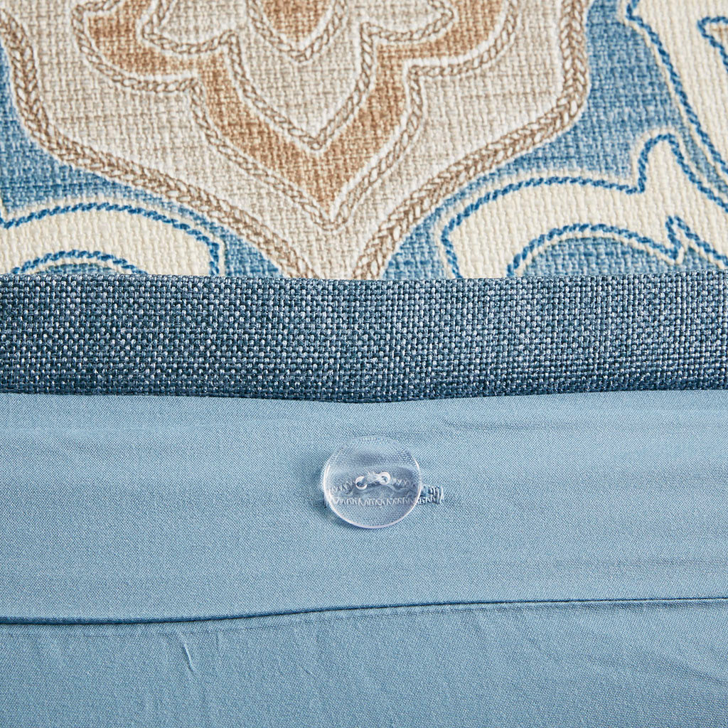Madison Park Signature's Caspian 9 Piece Medallion Print Comforter Set introduces an elegant traditional updated to your bedroom. The jacquard comforter features a distressed medallion print on textured ground fabric in shades of blue, ivory, and taupe, for an elevated coastal look. The oversized and overfilled comforter uses a removable duvet-style insert that is secured by inner ties and a hidden button closure. This provides no visible bartacking lines on top of the bed to create a smooth, clean face. Also included are 2 matching shams and 3 Euro shams that coordinate beautifully with the luxurious comforter. An oblong decorative pillow and 2 square decorative pillows showcase printed and embroidered designs on textured fabric removable covers to provide the finishing touches to this luxuriously elegant comforter set. Dry clean comforter cover only and machine wash comforter filler.