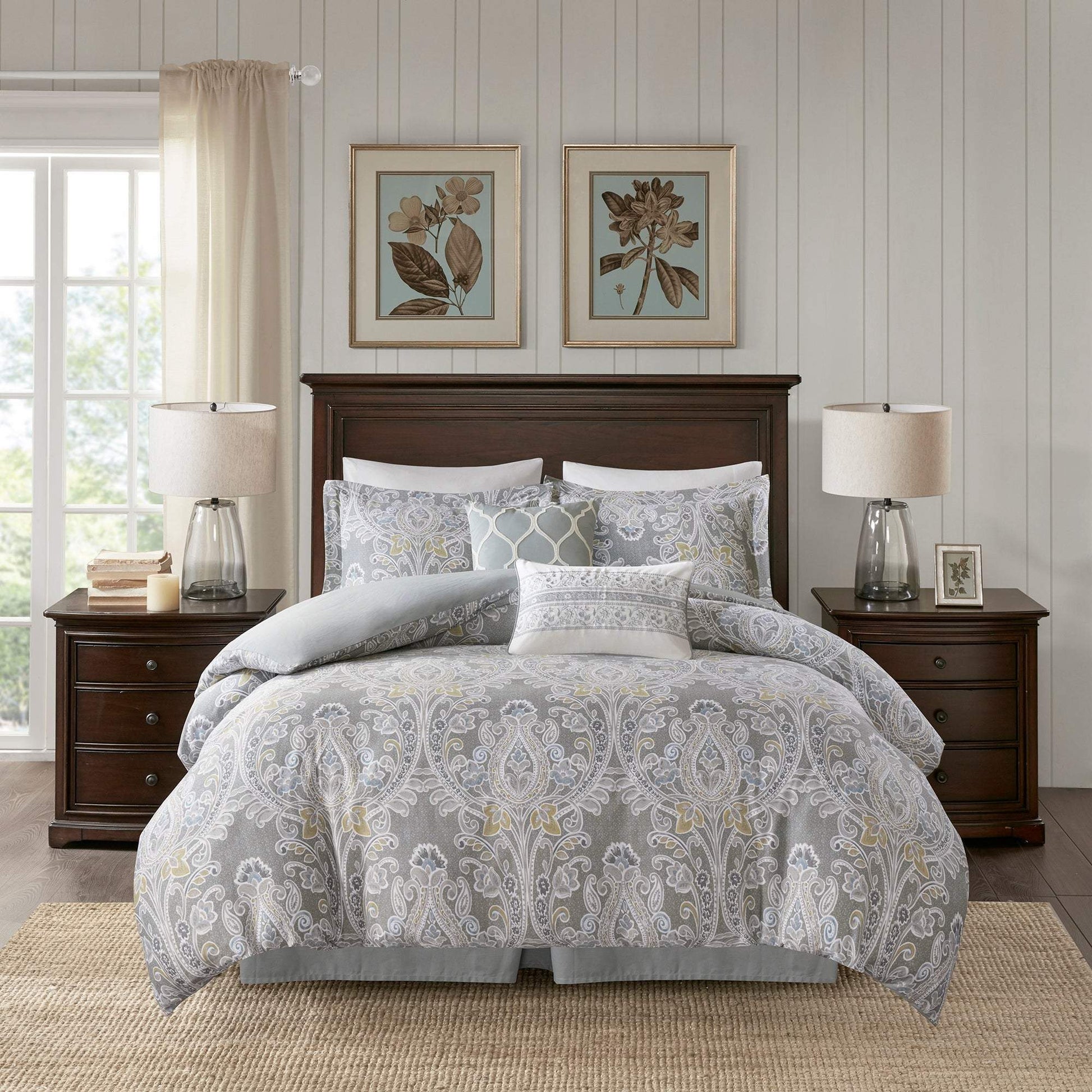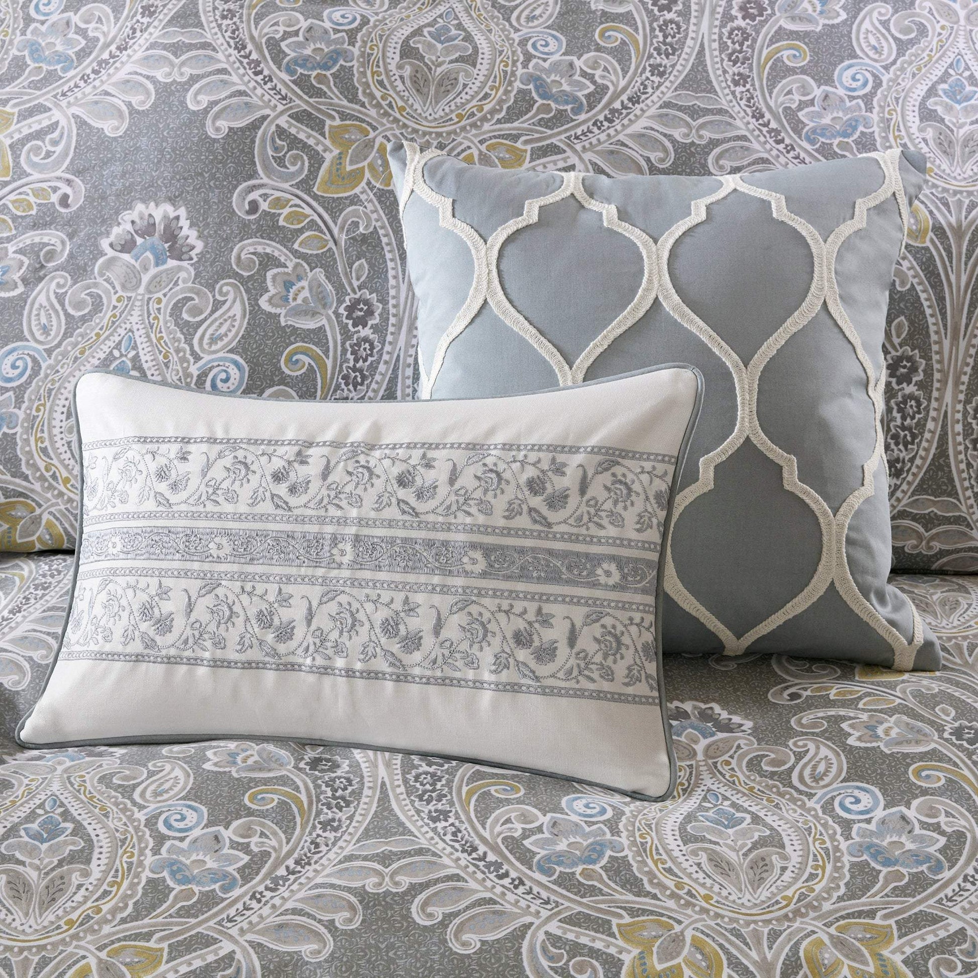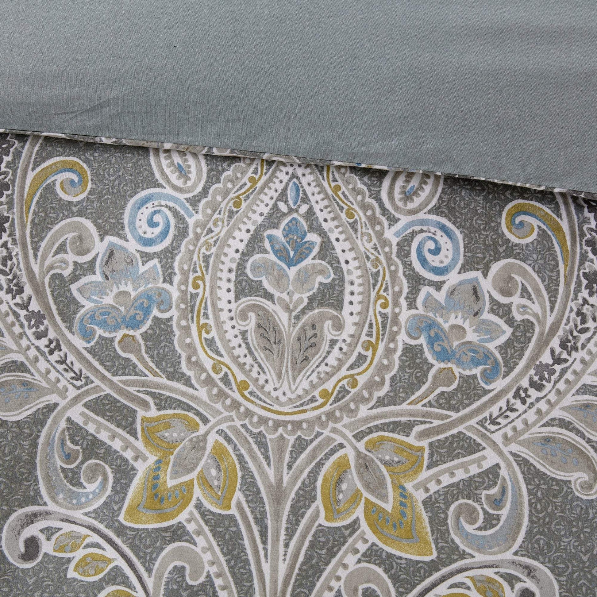 The Harbor House Hallie 6 Piece Cotton collections/comforter-sets/products/madison-park-talbot-red-7-piece-comforter-set">Comforter Set introduces an elegant and traditional allure to your bedroom decor. Flaunting a beautiful damask pattern in grey hues with hints of blue and yellow, the oversized and overfilled cotton comforter provides incredible softness and comfort. A solid grey reverse complements the top of the bed, while hidden bartacks give the comforter a duvet-like finish. Two cotton shams reiterate the damask print seen on the comforter to create a beautiful coordinated look. To complete the bedding set, two decorative pillows with embroidered details and a solid grey bed skirt provide the finishing touch. Made from soft cotton sateen, this comforter set will easily transform your bedroom into a stunning and lavish retreat. This bedding set is also OEKO-TEX certified, meaning it does not contain any harmful substances or chemicals, ensuring quality comfort and wellness.
