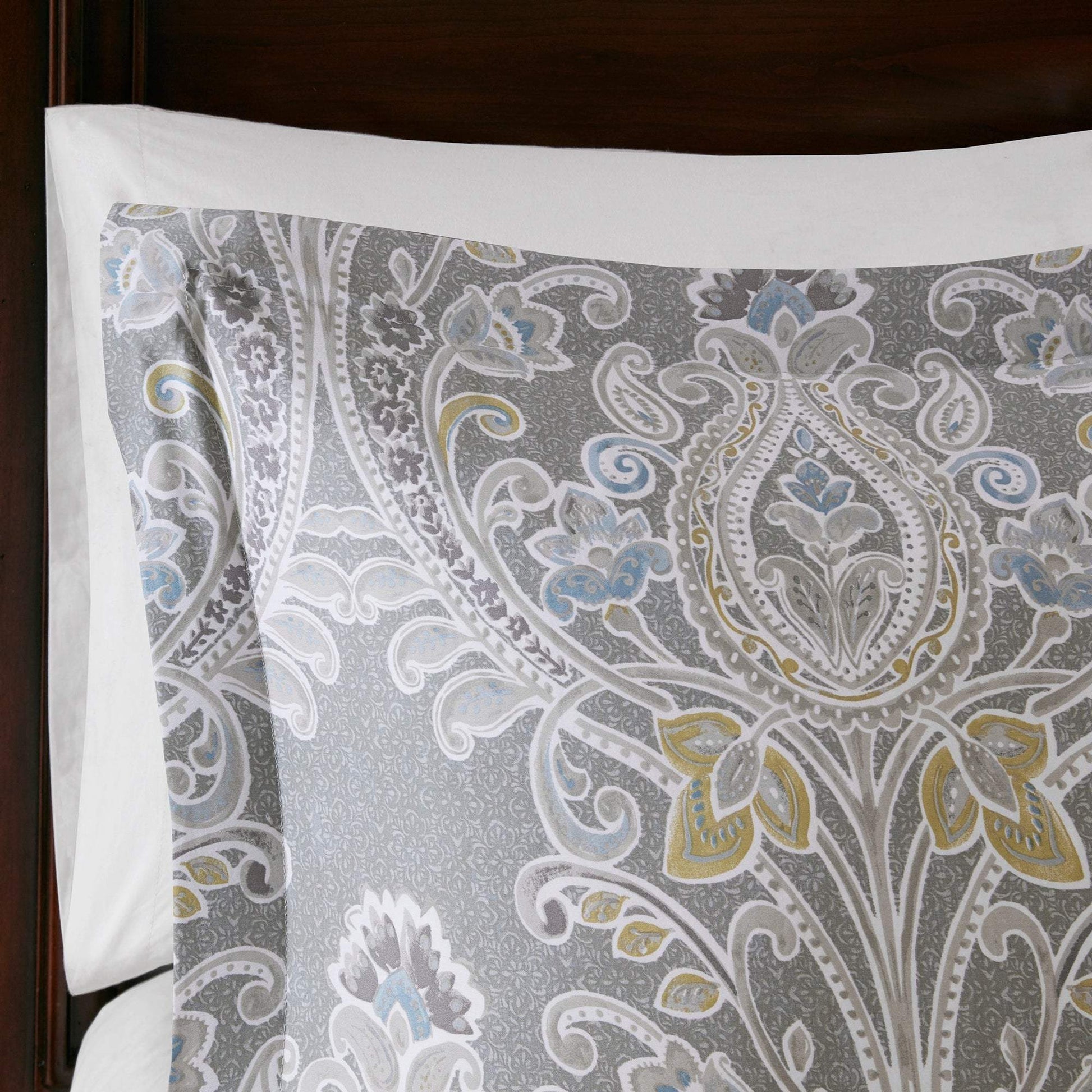 • Features an all over damask pattern in grey hues with hints of blue and yellow
