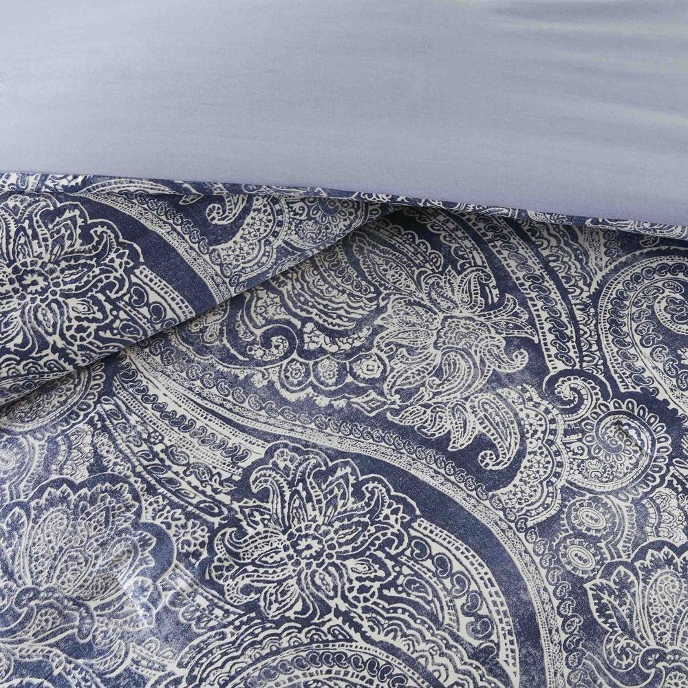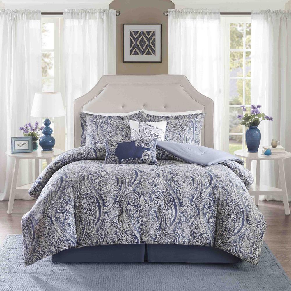 The Harbor House Stella 6 Piece Cotton collections/comforter-sets/products/madison-park-bennett-grey-7-piece-comforter-set">Comforter Set can give your bedroom a classic look with a modern touch. A beautiful biege paisley design lays on top of a blue background in different shades giving the overall bed almost a distress look. The 2 matching shams pair beautifully with the comforter and the 2 decorative pillows, 1 oblong and 1 square, add complementary touches. A solid blue bed skirt provides a clean finish to round out the timeless appeal of this cotton comforter set. This bedding set is also OEKO-TEX certified, meaning it does not contain any harmful substances or chemicals, ensuring quality comfort and wellness.