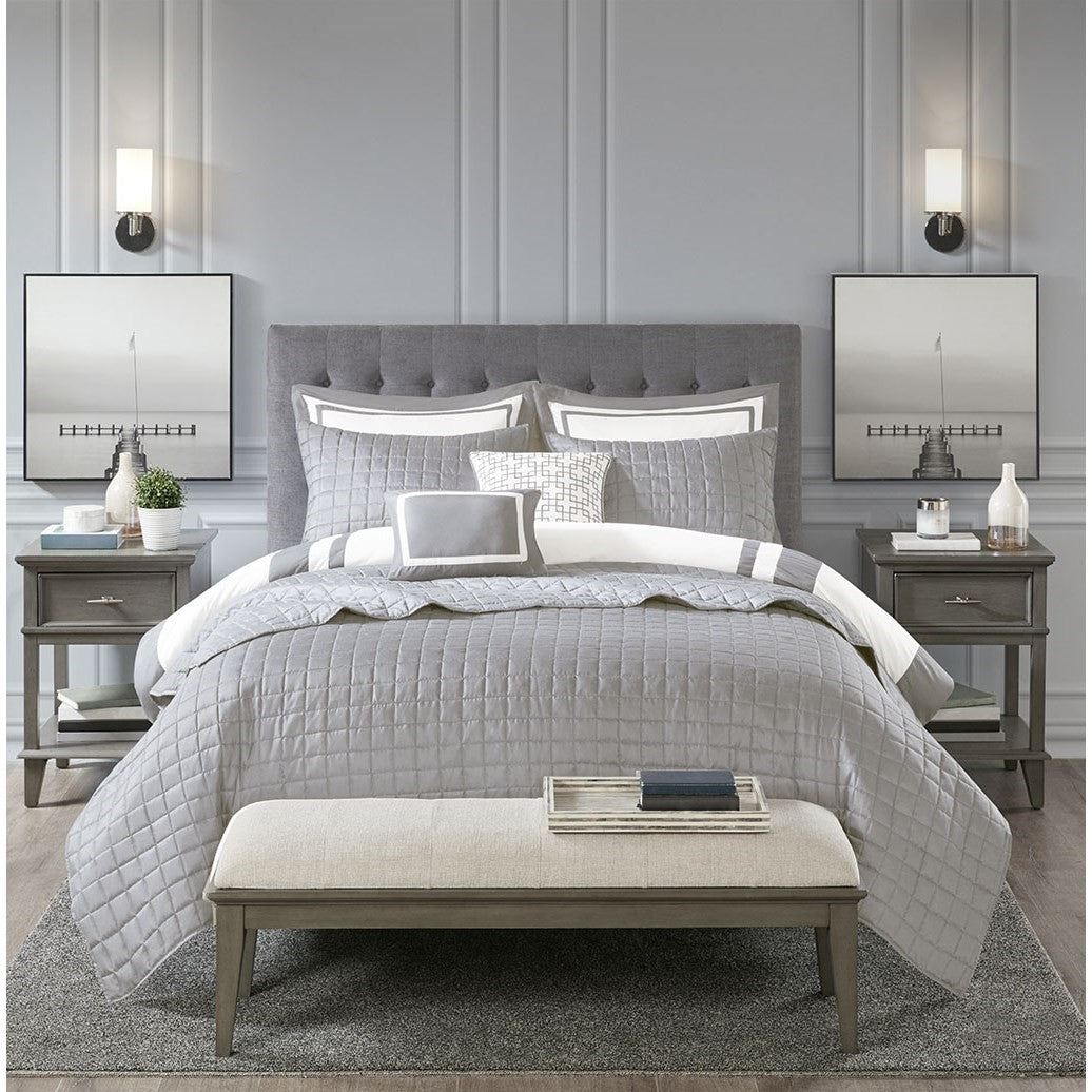 Create the perfect look in your bedroom with the Madison Park Heritage 8 Piece Comforter and Coverlet Set Collection. This hotel bedding collection includes a comforter and coverlet that both come with matching shams for a simple, yet luxurious look. The soft comforter and shams showcase a bold border on a white ground with a solid white reverse, while the coverlet and its shams display a window pane end-to-end quilting pattern. Two decorative pillows, one square and one oblong with embroidered and pieced details provide the perfect finishing touches to this 8 piece bedding set. Great for year-round use, this comforter and coverlet set collection provides exceptional warmth, comfort, and style to your bedroom decor.