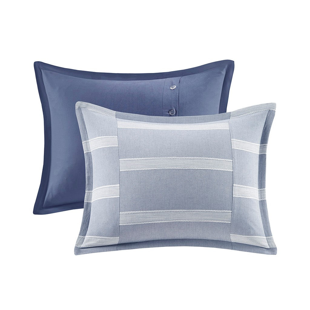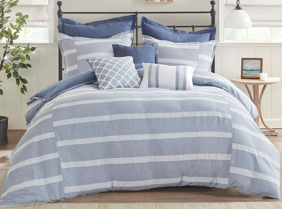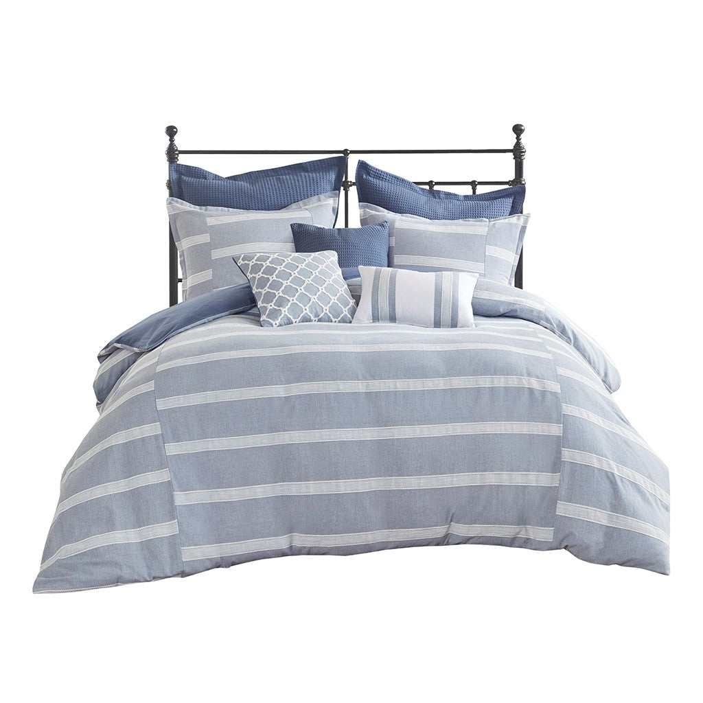 The Madison Park Signature Noble 8 Piece Cotton Comforter Set perfectly blends causal and elegant style to elevate your bedroom. This cotton comforter showcases a woven blue and white stripe pieced design to create an elegant farmhouse look. The cotton weave provides a subtle, soft texture to the oversized comforter, while the overfilled removable insert eliminates visible bartaking lines from the top of the bed, for a clean duvet-style aesthetic. Secured by inner ties and a button closure, the removable insert makes the comforter easy to clean. Also included are 2 striped shams and 2 Euro shams (3 in King) that pair handsomely with the farmhouse comforter. For the finishing touches, 2 square decorative pillows and 1 oblong decorative pillow with waffle matelassé and embroidered detailing complete this luxurious farmhouse comforter set.