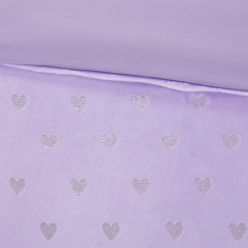 The Mi Zone Rosalie Metallic Printed Plush Comforter Set brings a bright and casual update to your bedroom. A silver metallic heart print adorns the purple plush comforter and shams (1 in Twin/TwinXL) creating a soft and fun look. An oblong decorative pillow with a pompom trim and hearts adds a lovely touch to the bedding set. This bedding set is also OEKO-TEX certified, meaning it does not contain any harmful substances or chemicals to ensure quality comfort and wellness.
