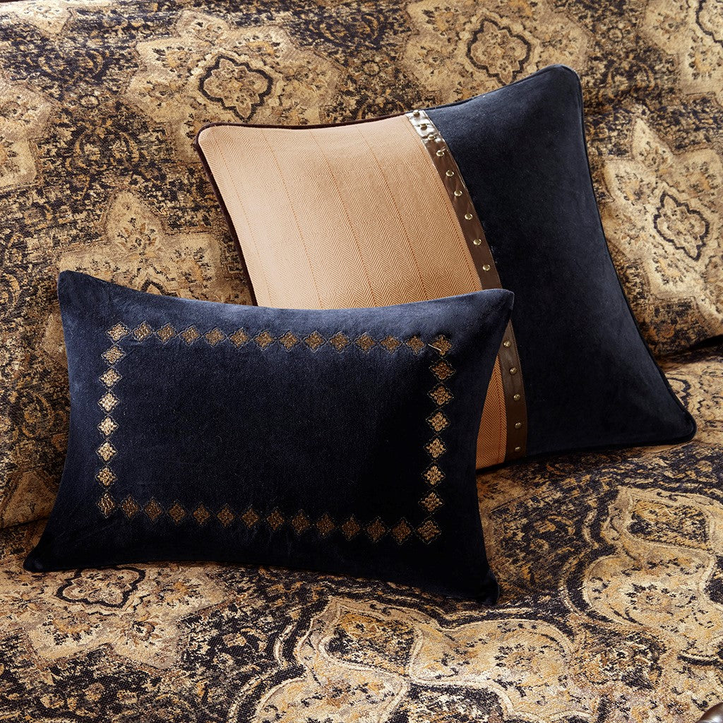 Madison Park Signature brings you the Wellington chenille comforter set that is sure to make your bedroom an abode of classiness. The beautiful oversized and overfilled bedding features a combination of damask design jacquard fabrics, contrast embroideries and black and gold accents. This set includes a comforter with jacquard woven details, 2 euro shams (3 in King) featuring herringbone plaid fabric with piping, 2 standard shams that match the comforter, 2 square decorative pillows with cotton slub base - 1 with embroidered damask pattern and cord trim at the edges, the other with herringbone plaid and metallic stud details on a brown faux leather trim;1 oblong pillow with metallic gold embroidery. The comforter comes with a removable insert and 4 inner ties and hidden button closure for a secure fastening. This provides no visible bartacking lines on top of the bed to create a smooth, clean face. Dry clean comforter cover only and machine wash comforter filler.PRODUCT DETAILS