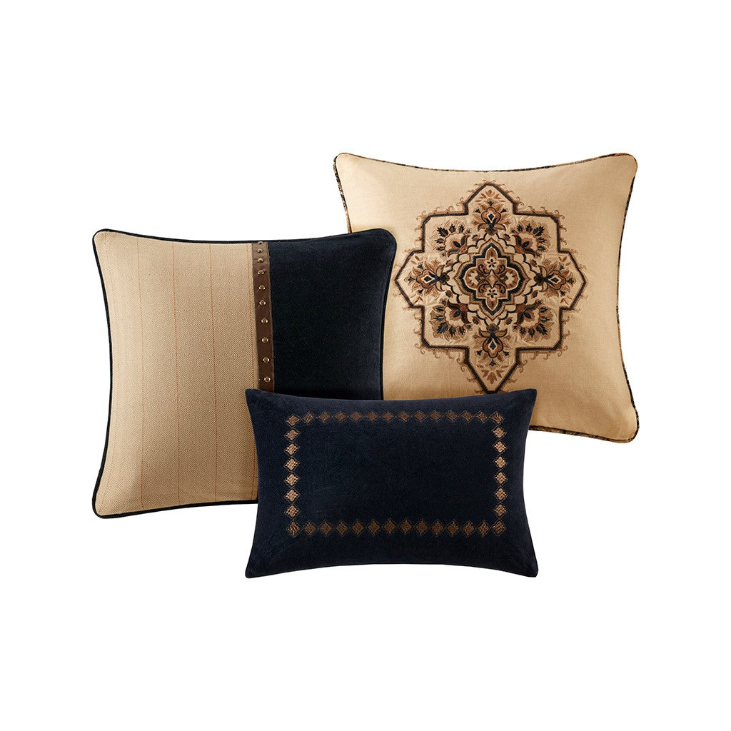 • Set includes comforter, 2 shams, 2 euro shams (3 in King size), 2 square and 1 oblong decorative pillows